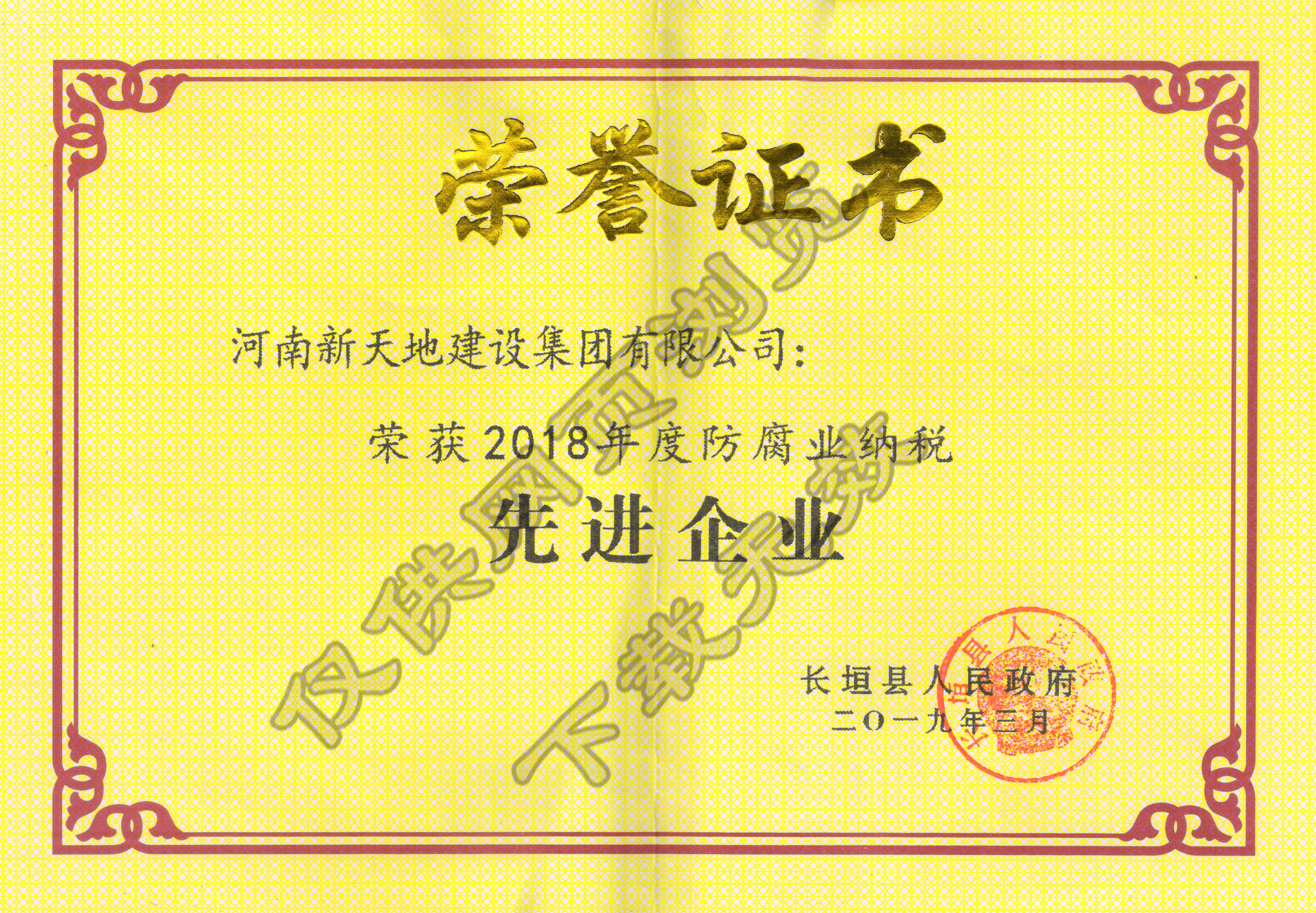 2018年度防腐业纳税先进企业-长垣县人民政府